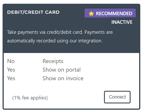 Once activated, all invoices sent to customers will have a button attached to the email allowing them to pay the fees online. They will also have the ability to pay via the portal.